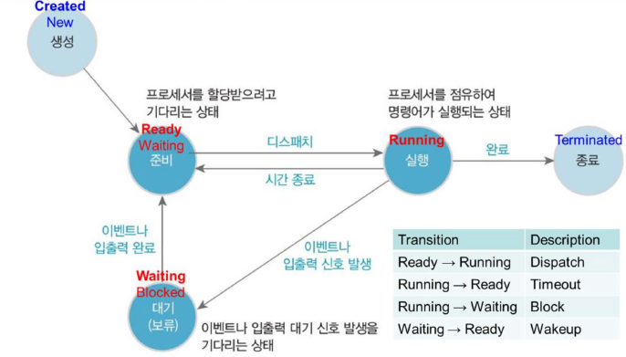 - 프로세스의 상태 변화는 운영체제가 프로세스 스케줄러를 이용하여 관리한다.